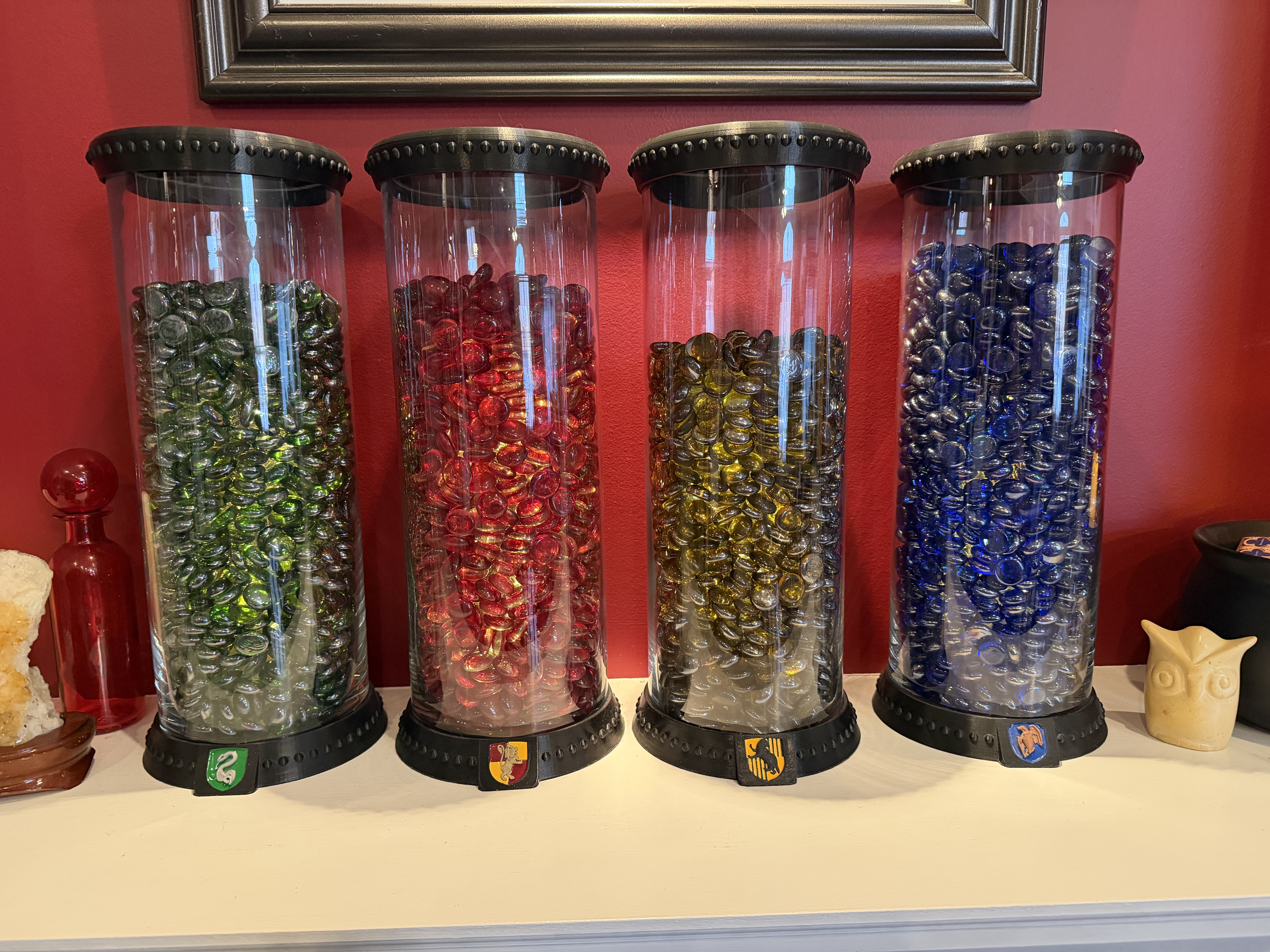 This is our version of the Hogwarts House Points “Hourglasses”. However, ours aren’t hourglasses but the large glass cylinder vases that you can get at Amazon, Walmart, Hobby Lobby, etc. We then place a string of remote controlled lights in a smaller cylinder vase and place it upside down in the larger ones. Then each one is filled with colored glass gemstone beads (vase filler beads).