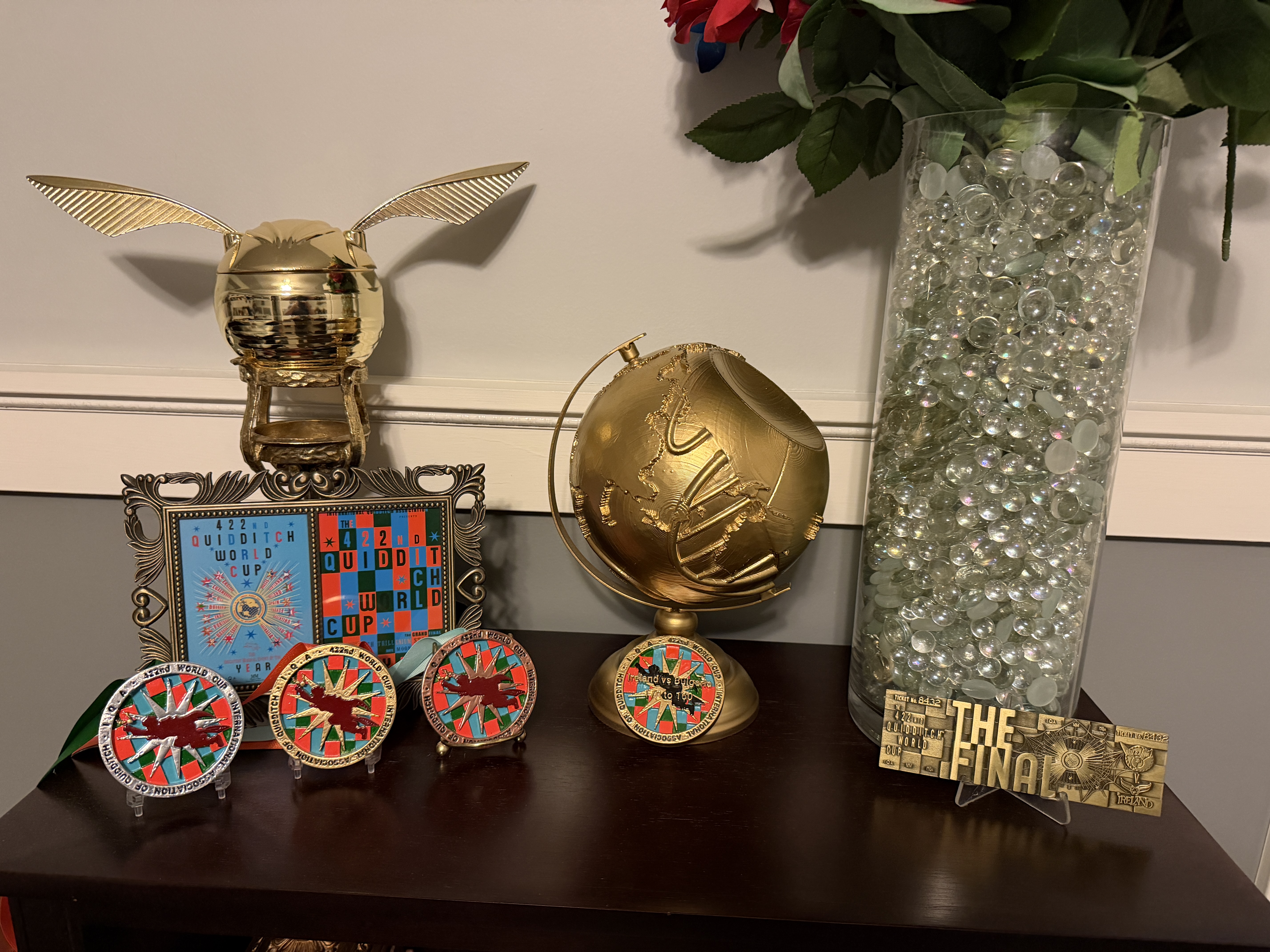 After many requests here are my files for our Quidditch World Cup Trophy and Medals Display. The globe was made in three sections and mostly fit togenter. I did have to do some filling and sanding. I also painted it with primer filler before painting with gold. Each section represents one of the types of balls used in Quidditch (the most popular wizarding world sport):